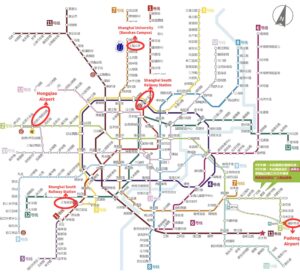 • Metro Path: Take Metro Line 2 from Hongqiao Airport to Jing’an Temple Station, then transfer to Metro Line 7 and ride until Shanghai University Station (Exit No. 2).